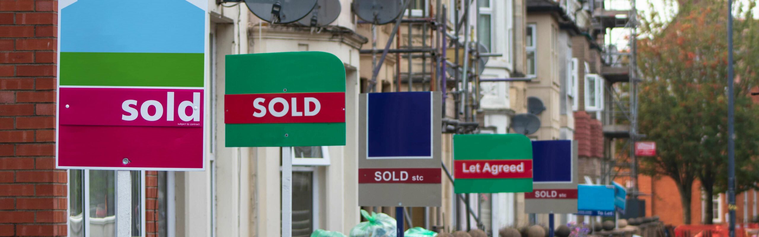A row of houses with different colored real estate signs displaying “SOLD” and “Let Agreed” posted in front. Joint agents and professional service Providers manage these homes, lined with satellite dishes in a bustling urban neighborhood. Trees and a street are visible in the background.