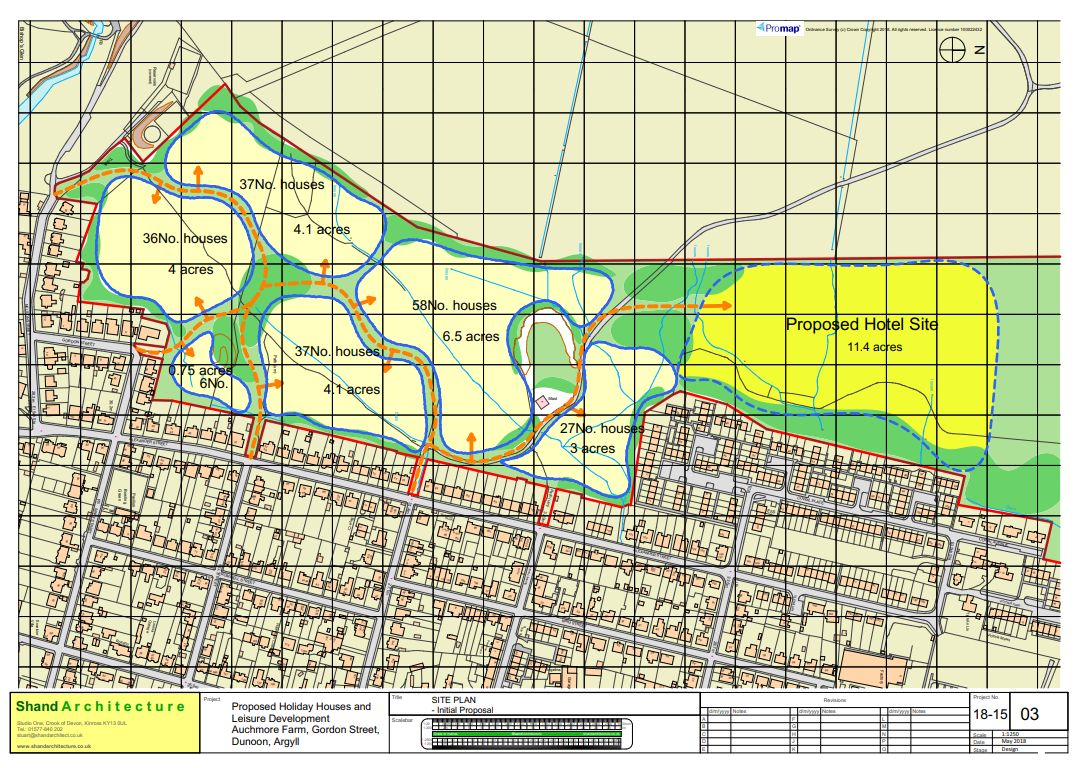 A site plan at Dunoon in Scotland shows the layout for proposed holiday houses and a hotel on a block of premodernity agricultural land. The plan includes marked areas for houses (37, 50, 27 units) and a hotel, with access roads. Available for sale by Auction with World of Auctions.
