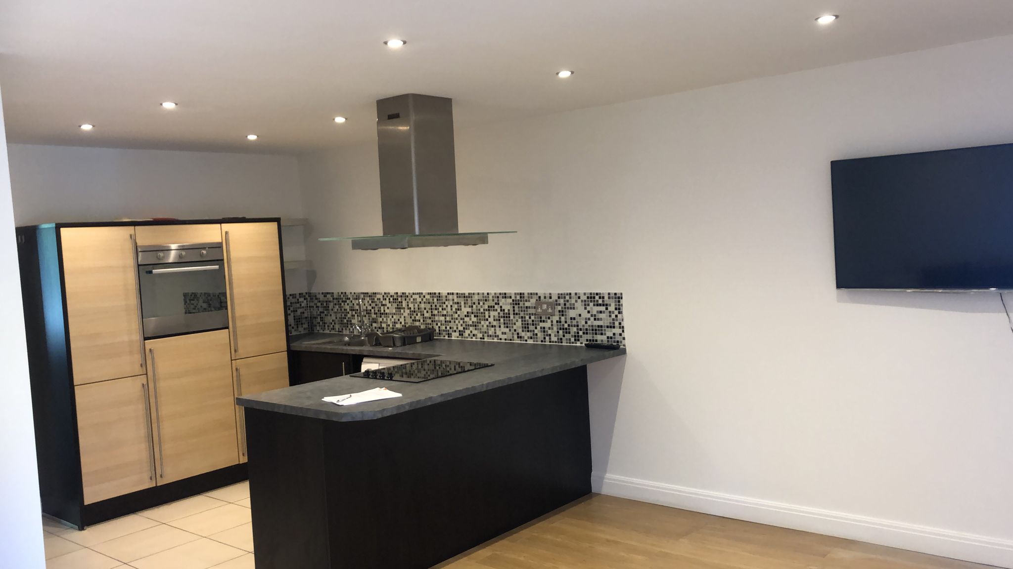 Property for sale by Auction A modern kitchen with light wood cabinets, a built-in oven, a stovetop with an overhead range hood, and a black countertop. A flat-screen TV is mounted on the white wall to the right. The backsplash features gray and black mosaic tiles. Presented by World of Auctions