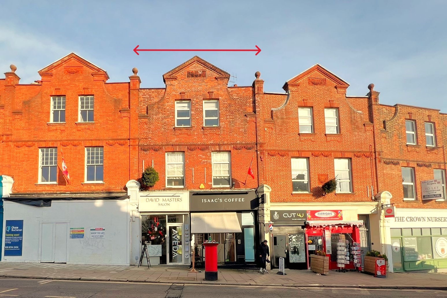 A row of red-brick buildings at 120 St. Margaret’s Road, TW1 2AA, featuring store signs like “David Masters Salon,” “Isaac’s Coffee,” “Cut-U,” and “The Crown Nutrition.” Available for sale by auction with World of Auctions, London, this mixed commercial and residential investment boasts decorative brickwork and dormer windows. A few people are seen walking