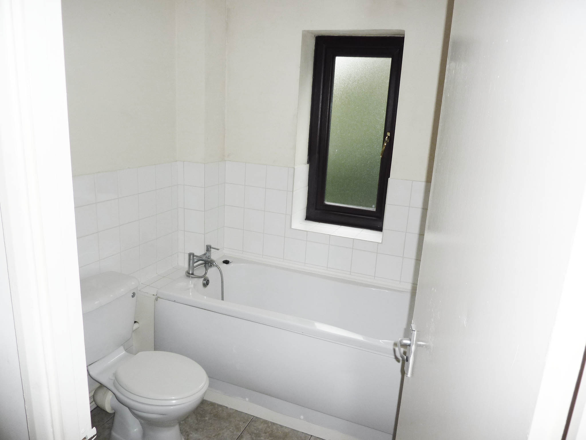 A small bathroom with white tiled walls and a frosted window offers views of Ruth House. It features a white bathtub with a silver faucet, a white toilet, and beige tiled flooring. The door is partially open. Available for sale by auction with World of Auctions.