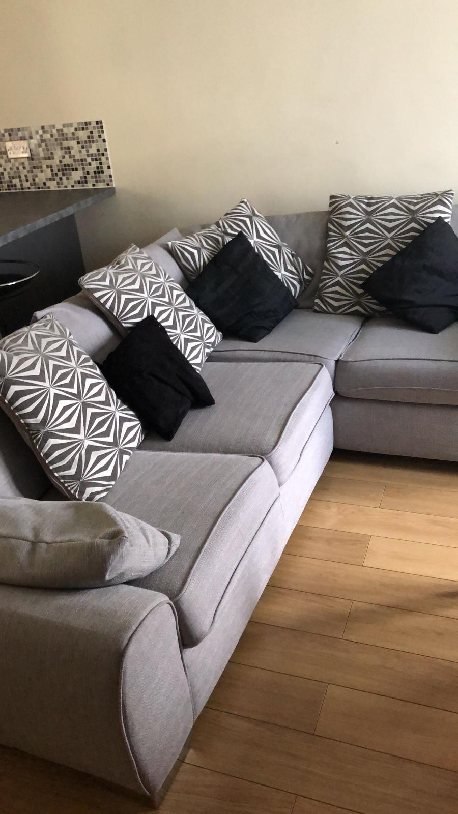Property for sale by Auction A gray L-shaped couch with a variety of geometric-patterned and solid black cushions sits on a light wooden floor. A small section of a mosaic-tiled wall is visible in the background. Presented by World of Auctions
