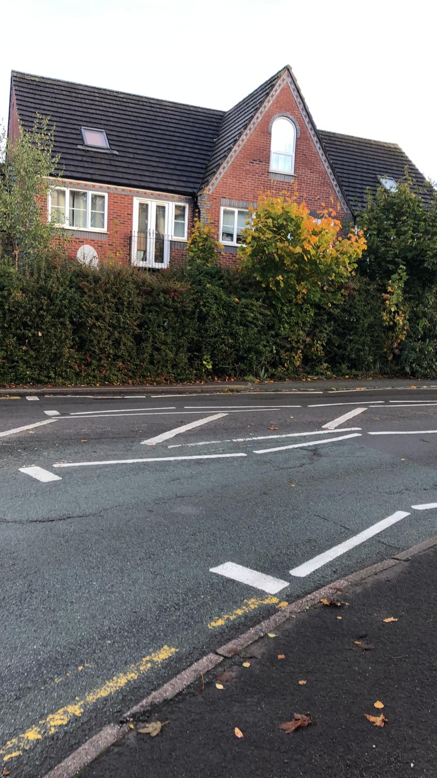 Property for sale by Auction A two-story brick house with a dark gray roof is partially obscured by a hedge. It’s situated behind a road with painted traffic lines and a yellow curb. The hedge has green leaves with touches of autumn colors. Presented by World of Auctions