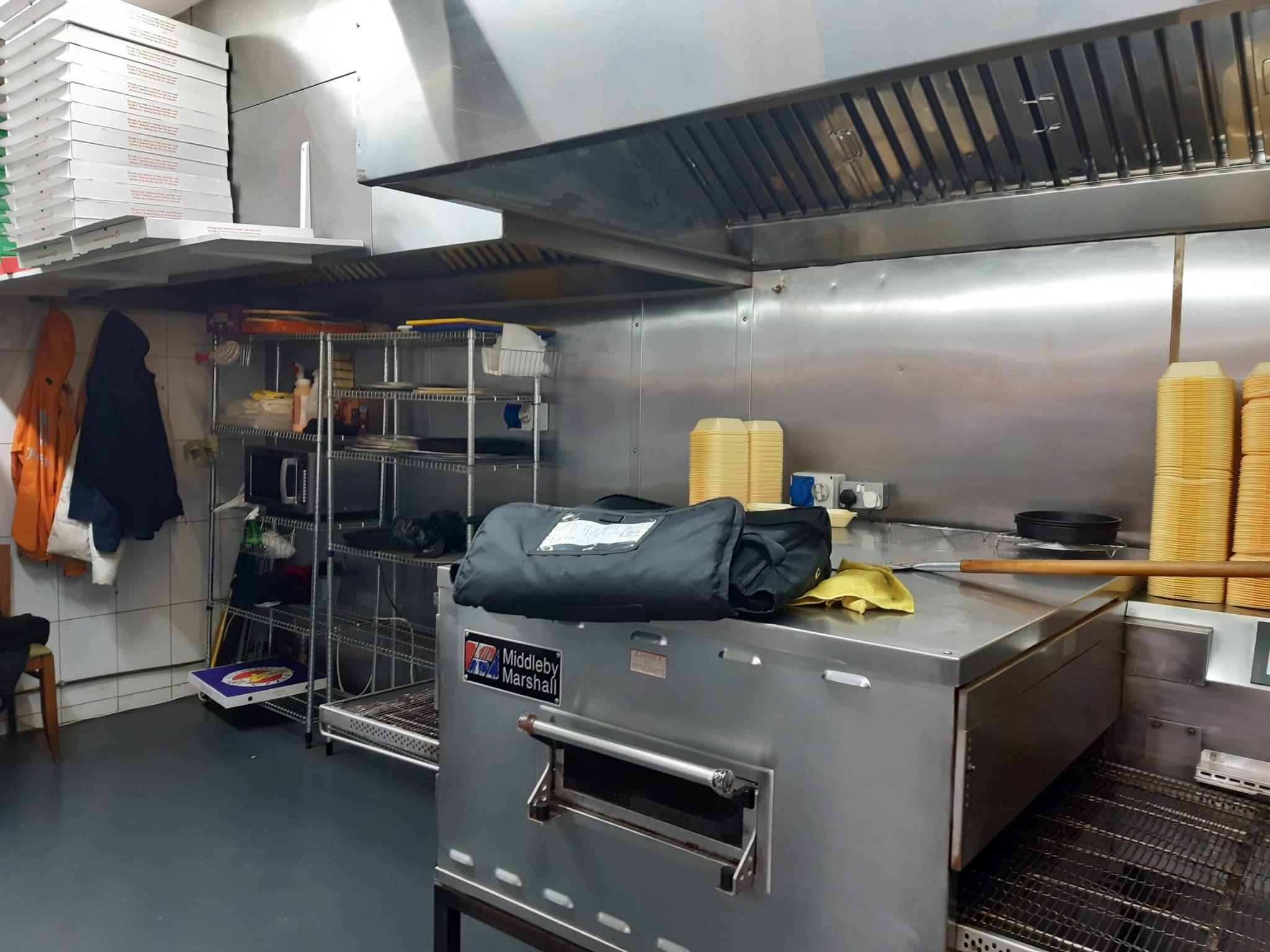 Property for sale by Auction A commercial kitchen in a bustling pizza shop 4 u, featuring a large industrial oven with a bag on top, shelving with pizza boxes, a microwave, and various supplies. The stainless steel walls and large ventilation hoods add to its efficiency. Yellow containers are stacked on a counter in the background. Presented by World of Auctions