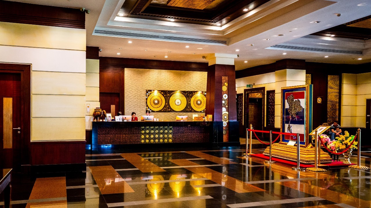 The Grand Pacific Sovereign Resort & Spa lobby features a polished floor, a check-in counter with attentive staff, and decorative wall accents. A roped-off display area to the right showcases a decorative piece and a floral arrangement. Warm lighting sets a cozy ambiance, enhancing this prime hotel investment opportunity.