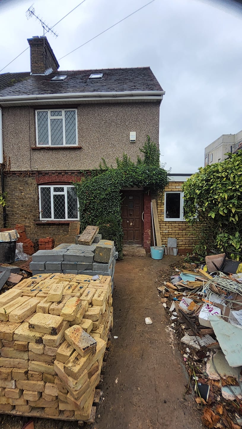 Property for sale by Auction A partially renovated house with a worn exterior. Bricks and construction materials are scattered in the front yard. A small door is partially covered by climbing plants, and a side extension is visible. Overcast sky above. Presented by World of Auctions