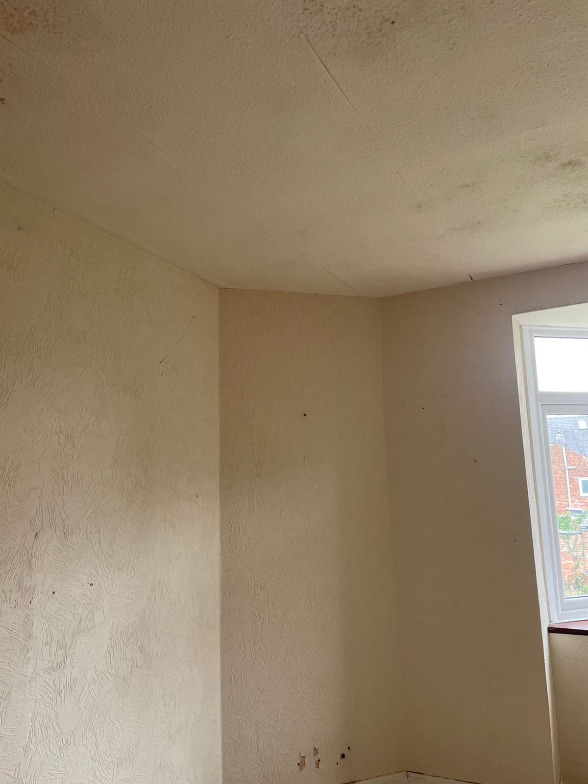 Property for sale by Auction A sparsely decorated room with textured cream walls and a white ceiling. There is a window on the right side, letting in natural light. The walls have slight discoloration and patches, indicating the need for some maintenance or repainting. Presented by World of Auctions
