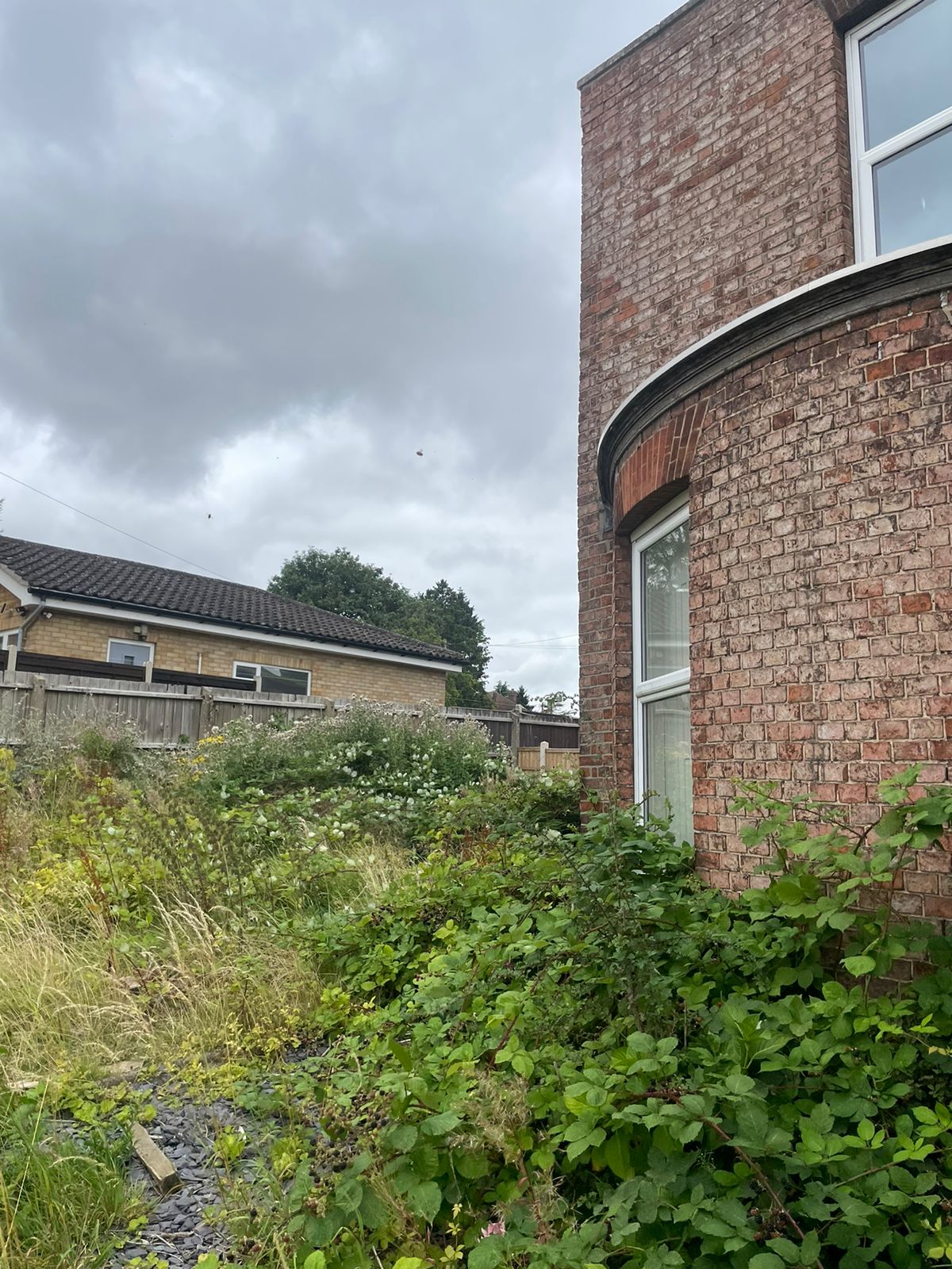 Property for sale by Auction A brick building with tall windows stands next to an overgrown garden filled with weeds and shrubs. In the background, a smaller house with a tiled roof is visible. The sky is overcast with dark clouds, indicating possible rain. Presented by World of Auctions