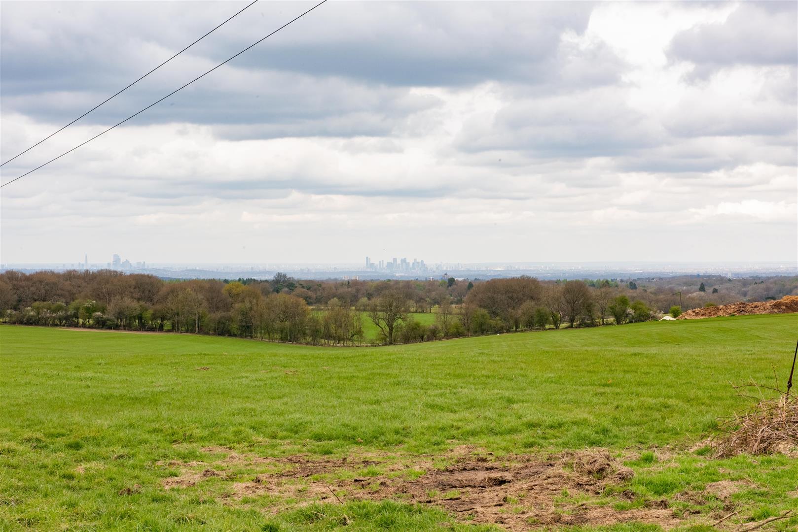 A wide view of a green, grassy field leading to a dense woodland with a distant city skyline visible under a cloudy sky. Two power lines cross diagonally in the near foreground. The horizon separates the green land from the grey, overcast sky.