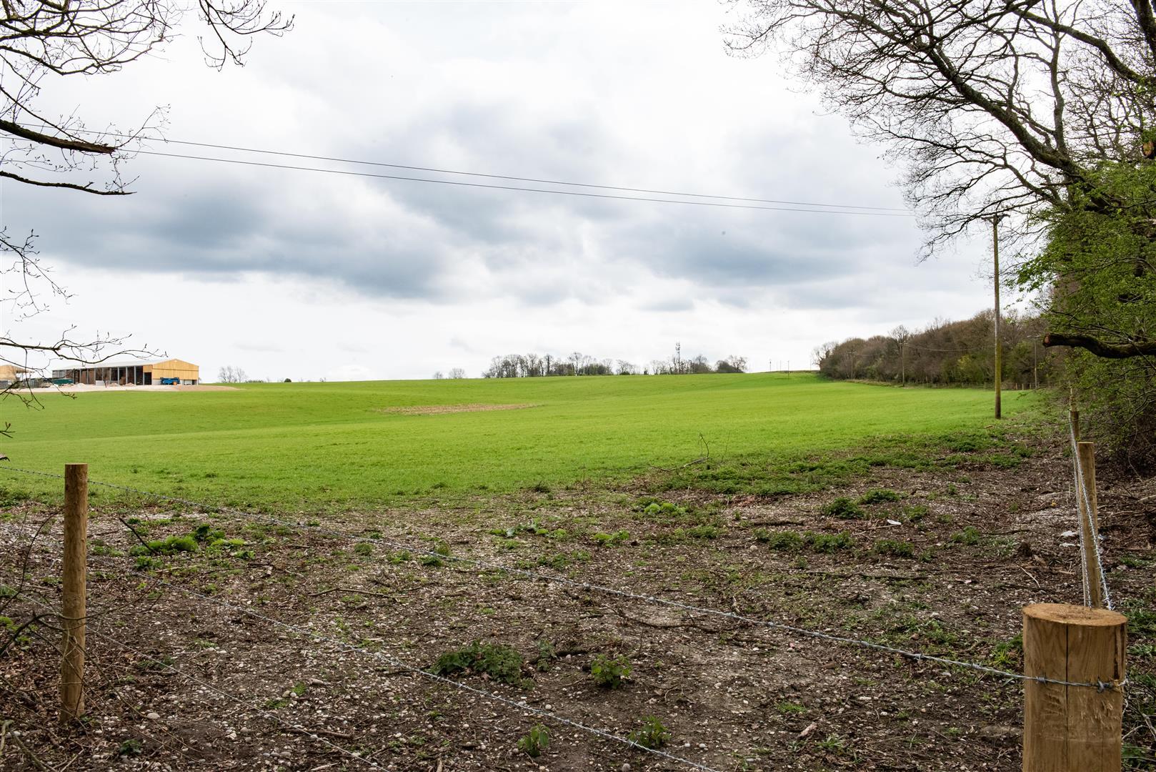 A vast, green field stretches under a cloudy sky, bordered by a wooden fence with wire. Leafless tree branches frame the image from the top left and right. A structure sits in the far left background. Trees line the horizon on the right side.