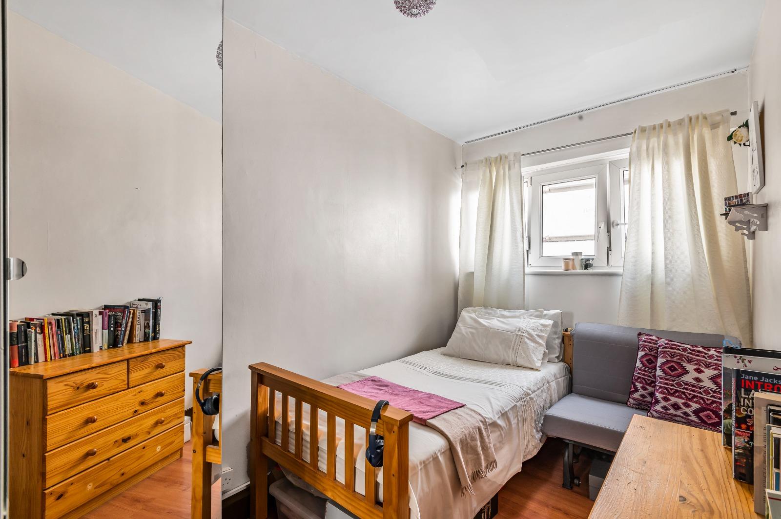 Flat 3 at Macclesfield House, Central Street, LONDON EC1V 8BA features a small, cozy bedroom with a single bed adorned with a white and pink blanket. Beside the bed sits a grey chair and a light wooden chest of drawers topped with books. Natural light filters through the window with white curtains, highlighting the room’s light-colored walls and hardwood flooring. This investment Presented by World of Auctions