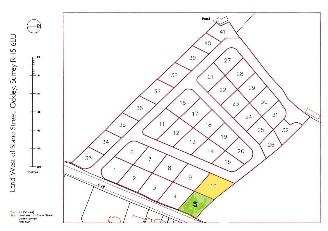 A map showing a plot layout of a land development site at Land West of Stane Street, Ockley, Surrey RH5 5LU. The site is sectioned into numbered plots, with plot 10 highlighted in yellow and an area marked with an “S” in green. Sold by World of Auctions.