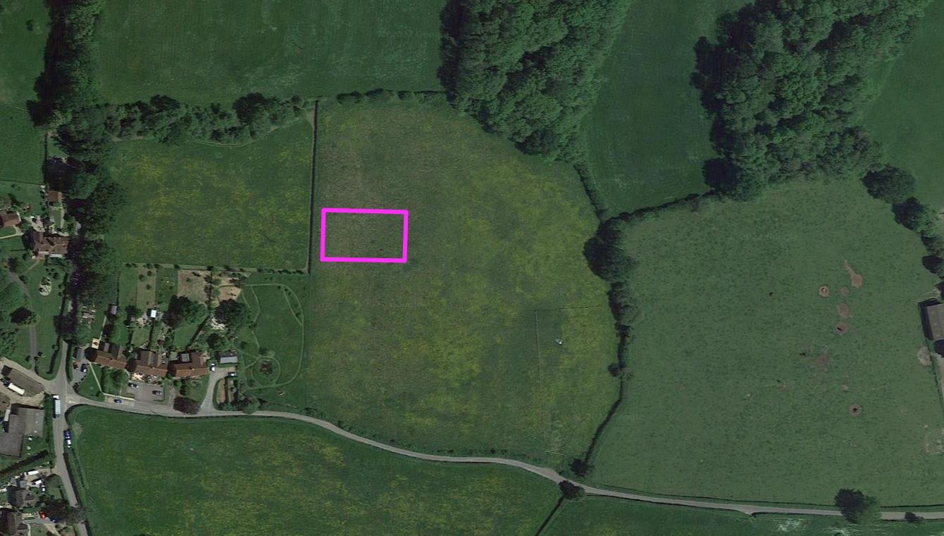An aerial view of a landscape featuring green fields and dense tree areas. There is a small village with residential buildings to the left. In the center, a rectangular outlined plot of land stands prominently in the middle of the fields, periodically for sale with Palace Auctions London and World of Auctions.