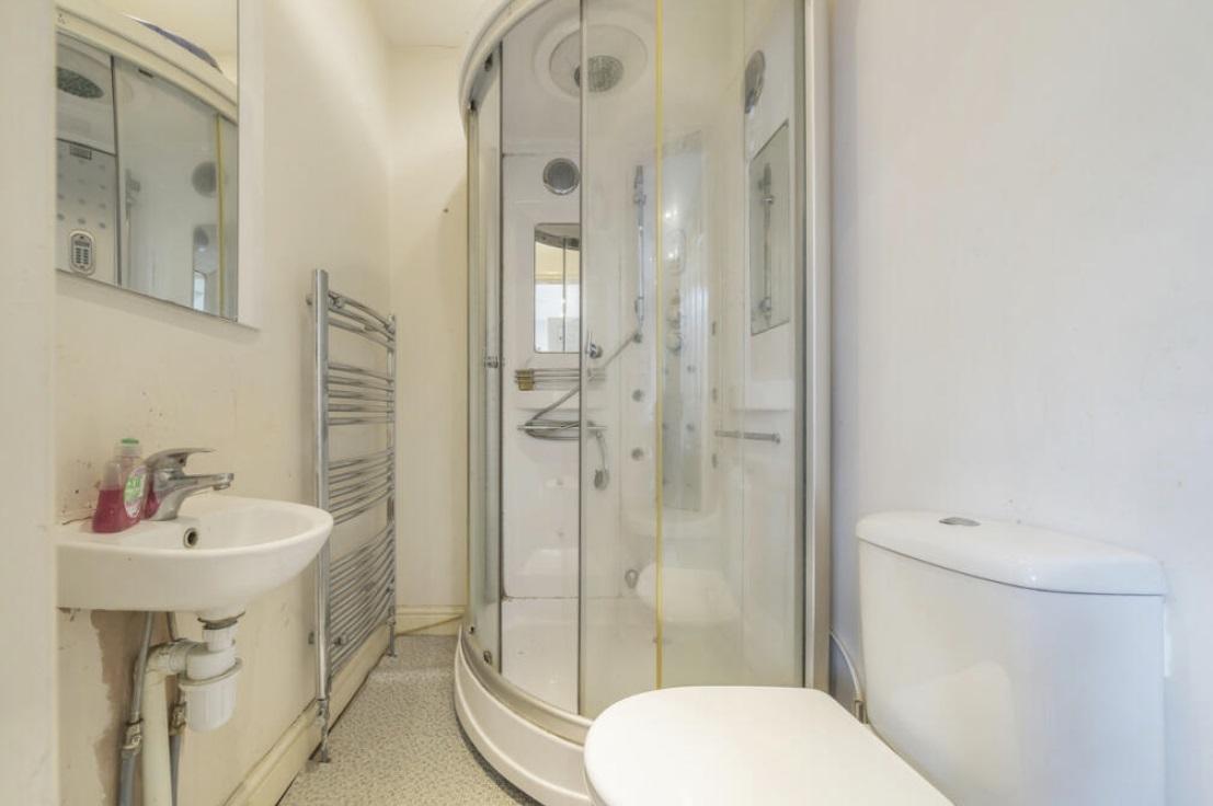 Property for sale by Auction A small bathroom on Rowan Avenue features a white sink on the left with a wall-mounted mirror above it, a silver towel radiator on the left wall, a rounded glass shower enclosure in the center, and a white toilet on the right side against a pale-colored wall. Presented by World of Auctions